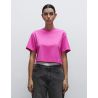 Un haut court pour femme avec une coupe carrée, coupé juste en dessous du nombril, avec un biais féminin sur la coupe. La pièce a un col côtelé allongé, une épaule tombante, des coutures d'épaule rabattues avec une double aiguille aux ouvertures des manches et un ourlet plié exagéré. Il est fabriqué en jersey simple de poids moyen fabriqué à partir de coton 100 % biologique. Les tailles vont du XS au XL, en blanc cassé et noir cassé, plus un coloris hyper rose.